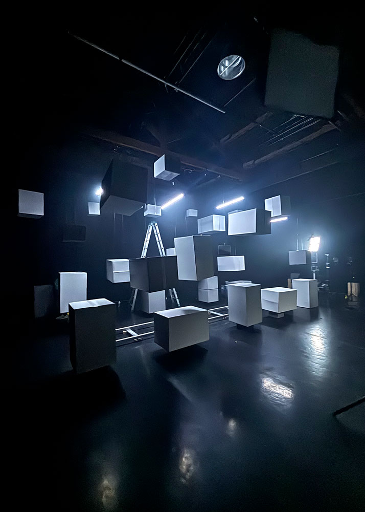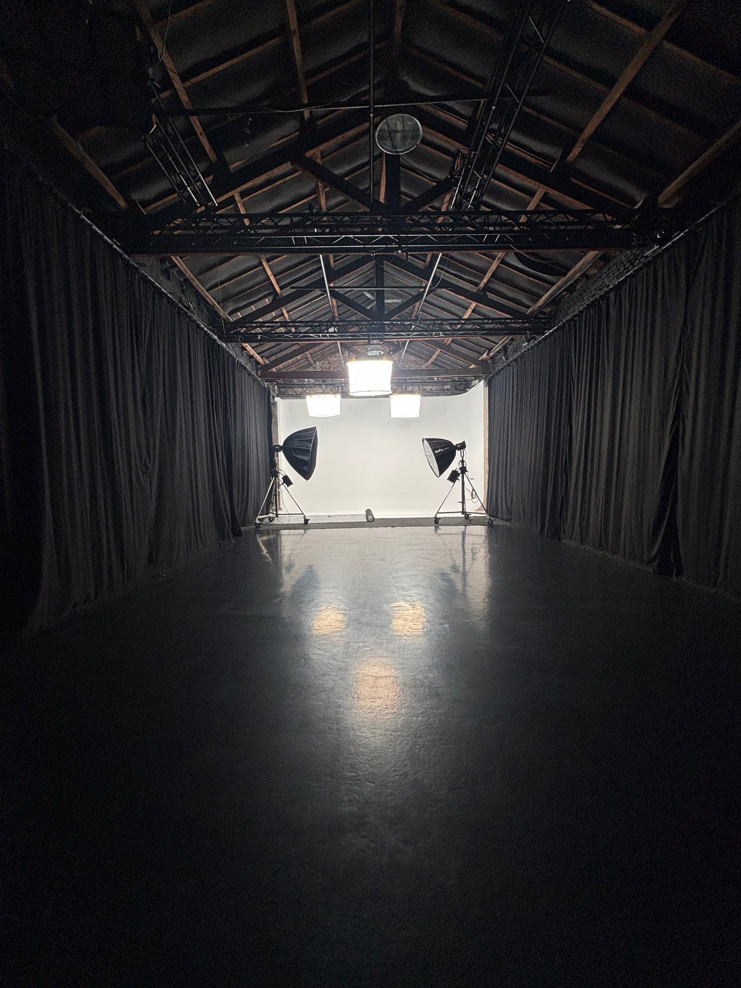 Nave de 200m2. Muro visto de ladrillo, carril con telón negro y croma. Altura de 470cm hasta el trust. Trust electrificado y dmx. Aire acondicionado, wifi y IP fija para emisión via streaming.